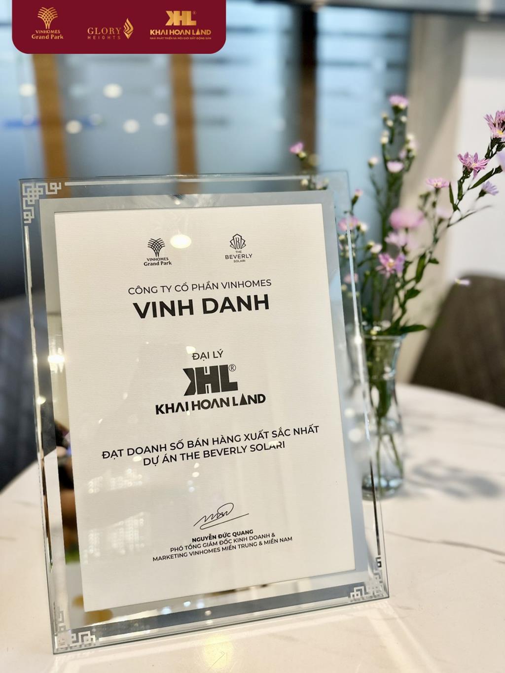 Bằng tất cả những nỗ lực và quyết tâm chạm đến những đỉnh cao vinh quang, Tập đoàn Khải Hoàn Land tự hào mang về thành tích đầy ấn tượng khi vinh dự là ĐẠI LÝ ĐẠT DOANH SỐ BÁN HÀNG XUẤT SẮC NHẤT DỰ ÁN THE BEVERLY SOLARI.